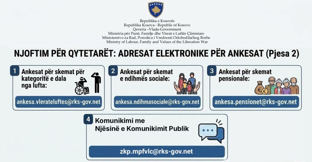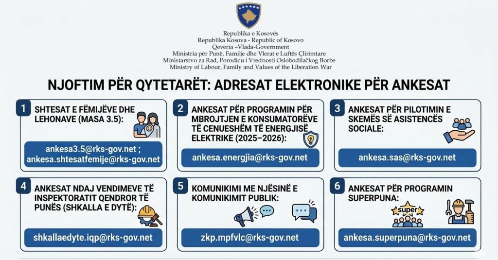 Për të garantuar transparencë, përgjegjësi institucionale dhe ushtrimin e plotë të të drejtës suaj ligjore për ankesë, Ministria për Punë, Familje dhe Vlerat e Luftës Çlirimtare ka funksionalizuar adresat zyrtare elektronike për paraqitjen e ankesave nga qytetarët.